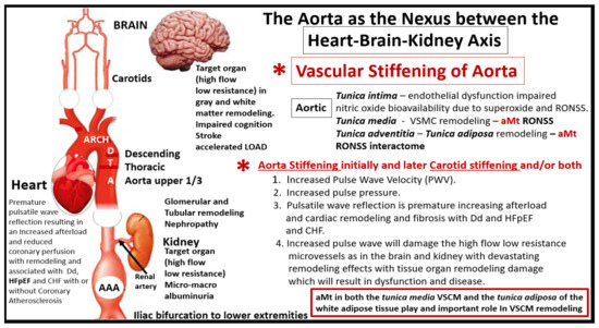 It is important to discuss Mt remodeling in the descending thoracic aorta to better understand its relationship to vascular stiffening and the heart-brain-kidney (HBK) axis as discussed in Figure 3 and how this links aortic stiffening and its relationship for the progression to end-organ damage in HBK axis in obesity, IR, impaired glucose tolerance, MetS, and T2DM.