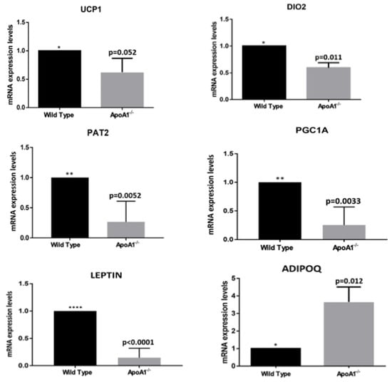 2.2. ApoA1 Deficiency Is Associated with Reduced Expression of the BAT-Specific Genes and Differential Expression of the Two Major Adipokines Leptin and Adiponectin