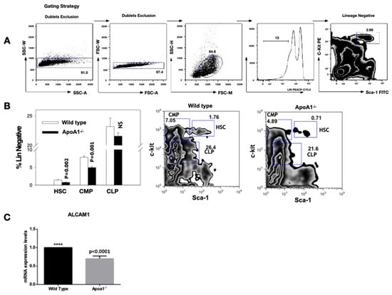 Flow cytometric analysis of whole bone marrow cells. Four animals of each group were tested; (A) Gating strategy for hematopoietic stem cells (HSC). The live Lin-population indicated by the bar is further analyzed for c-kit and Sca-1 expression; (B) The HSC (Lin-c-kit + Sca1+) and the common myeloid progenitors (CMP; Lin-c-kit + Sca1−) compartment, were significantly reduced in the ApoA1 KO compared to their wild-type (WT) littermates. On the contrary, the common lymphoid progenitors compartment (CLP; Lin-c-kit low Sca1 low) was unaffected. Data from one representative experiment is shown; (C) Reduction in Alcam1 (activated leukocyte cell adhesion molecule 1) expression in the ApoA1 KO compared to the wild type mice (****: p ≤ 0.0001).