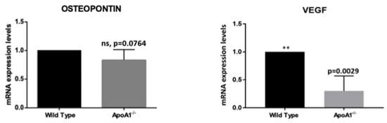 Recent studies showed that the multifunctional protein osteopontin (Opn) promotes BAT synthesis from white pre-adipocytes via activation of the PI3K-AKT signal transduction pathway []. In the same context, several lines of evidence suggest that vascular endothelial growth factor (VEGF) participates in WAT vasculature regulation, promoting angiogenesis and WAT ‘beiging’ [,]. Triggered by this, in the present work, we examined the mRNA levels of Opn and Vegf in the WT and the ApoA1 KO mice. We found that whole bone marrow cells obtained from ApoA1 deficient mice exhibit robust Vegf mRNA downregulation (p = 0.02) and notable Opn reduction (p = 0.007), which, however, did not quite reach statistical significance (p = 0.076) (Figure 4). These findings suggest a possible role of these molecules in the ‘white-to-brown/beige’ transition.