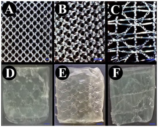 Bacterial cellulose-coated and uncoated surgical meshes. (A–C) uncoated meshes, (D–F) bacterial cellulose-coated meshes; (A,D)—M1; (B,E)—M2; (C,F)—M3, the blue bar represents the length of 2 mm.