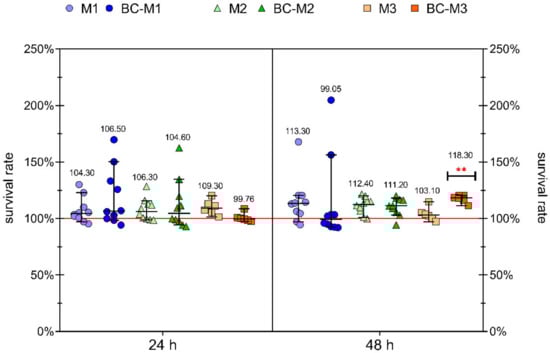 Survival rate (%) of fibroblast cell line ATCC CCL-1 with 24 h and 48 h extracts from bacterial cellulose-coated and uncoated surgical meshes. M1, M2, M3—uncoated meshes; BC-M1/M2/M3—meshes coated with bacterial cellulose; whiskers show median with 95% confidence interval; median values (%) are shown over every scatter dot plot; ** moderate statistically significance (p = 0.0059); red line is control sample = 100% of survivability.
