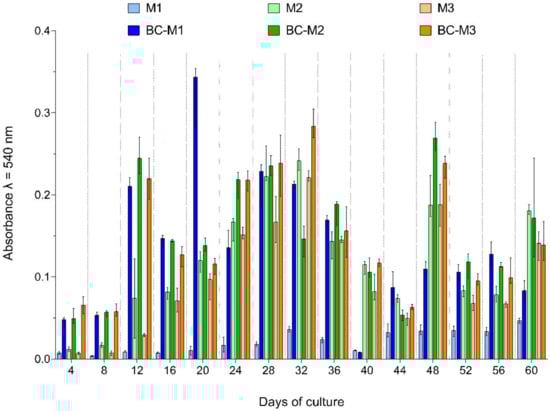 In all samples, an increase of fibroblast quantity to the 28th or 32nd day of culture was observed, and then a decrease was noticed. The results obtained for samples M1 and BC-M1 were differentiated from the remaining results. Fibroblast growth on the M1 was very poor during the entire duration of culturing. The absorbance value between the 4th and 60th day of culture increased less than 6 times (about 15 and 20 times for M2 and M3, respectively). The first growth peak was observed on the 32nd day of culture, and then it decreased, and there was another increase on the 44th day of culture. Between the 44th and 56th day of culture, the fibroblasts growth was on a constant level, and on the 60th day of culture a moderate increase was observed. In the last day of culture, the highest quantities of fibroblasts on the M1 surface were observed. Sample BC-M1 demonstrated a different pattern of fibroblasts growth. The first growth peak was observed on the 12th day of culture; then there was a slight decrease and another peak on the 20th day of culture. Then, two periods, namely a decrease and increase of fibroblast quantity was noticed. The highest quantity of fibroblasts was measured on the 20th day of culture. The high decrease of fibroblasts quantity was observed on the 40th day of culture. Comparing fibroblast growth on M1 and BC-M1 samples, there were very noticeable differences in favour of the BC-M1 sample. On each measurement day between the 4th and 32nd, the differences between M1 and BC-M1 samples were significant (p < 0.0001), and later the differences decreased (no significant difference on days 40th, 52nd and 60th; p = 0.0130 on 48th day, and p = 0.0095 and p = 0.0091 on the 48th and 56th days, respectively). More statistical details and graphical demonstrations of results are shown in Figures S2 and S3 and in Table S5 in Supplementary Materials.
