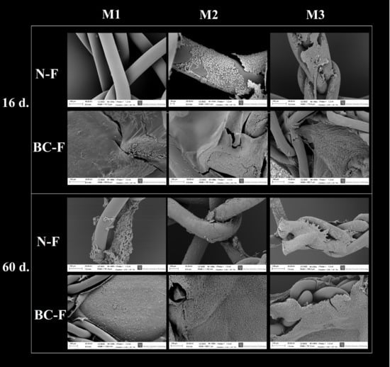 SEM images showing changes in cell quantity between the 16th and 60th day of culture. M1, M2, M3—tested meshes; N-F—native meshes with fibroblasts; BC-F—bacterial cellulose-coated meshes with fibroblasts; 16 d.—16th day of culture; 60 d.—60th day of culture scanning electron microscope (SEM, Zeiss EVO MA25, Oberkochen, Germany); M—magnification (223×–513×, below every picture).