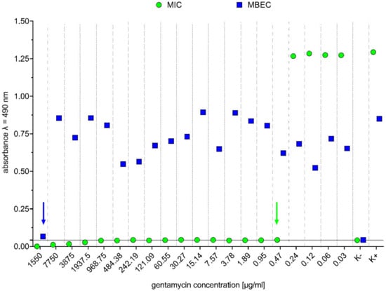 Minimal inhibitory concentration (MIC) and minimal biofilm eradication concentration (MBEC) of gentamicin for Staphylococcus aureus ATCC 33591. Green arrow indicates MIC value (0.47 µg/mL), and blue arrow indicates MBEC value (1.55 mg/mL). K– is a negative control, and K+ is positive.