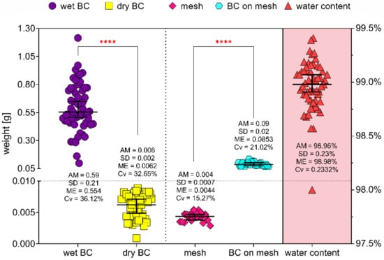Graphical demonstration of meshes and bacterial cellulose weight and water capacity of bacterial cellulose. AM—arithmetic mean; SD—standard deviation; ME—median; Cv—coefficient of variation; ****—very high statistically significance (p < 0.0001); whiskers show median with 95% of confidence interval.
