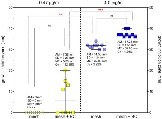Staphylococcus aureus ATCC 33591 growth inhibition zones (mm2) caused by bacterial cellulose-coated and uncoated meshes, saturated with gentamicin in two concentrations: 0.47 µg/mL and 4.0 mg/mL. AM—arithmetic mean; SD—standard deviation; ME—median; Cv—coefficient of variation; ***—high statistically significance (p = 0.0003); **—moderate statistically significance (p = 0.0084); ns—no significant differences; whiskers show median with 95% of confidence interval.