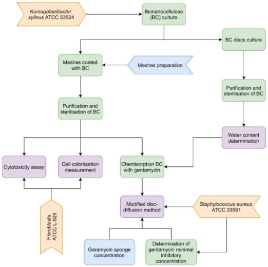 Therefore, the aim of our investigation was to evaluate the suitability of bacterial cellulose coupled with antibiotics as an absorbent layer of surgical mesh in the context of antimicrobial prophylaxis. We also carried out a long-term cell colonisation measurement assay (60 days) to investigate if the high level of BC-modified mesh colonisation by fibroblasts, reported in other research, are maintained during such a long period of time.