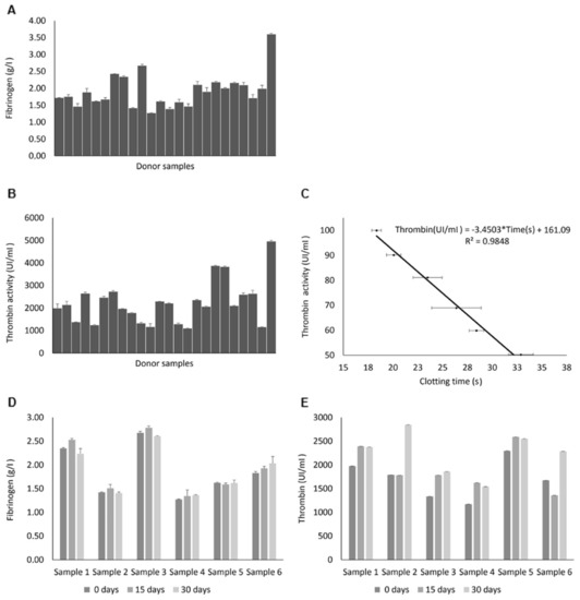 Analysis of thrombin concentrate and fibrinogen samples. (A) Fibrinogen concentration (g/L) in each FFP used. (B) Enzymatic activity (UI/mL) in each thrombin concentrate produced. (C) Standard curve used to calculate the enzymatic activity of each thrombin concentrate [y (UI/mL) = −3.4503 × x(s) + 161.09]. (D) Fibrinogen concentration (g/L) variation after storage at −80 °C and thawing at different times up to 30 days. Samples did not show a significative depletion (p > 0.05). (E) Enzymatic activity (UI/mL) variation after storage at −80 °C and thawing at different times up to 30 days. Samples did not show a significative depletion (p > 0.05). Data expressed as mean ± SD.