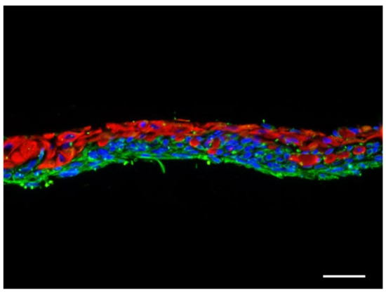 Immunofluorescence study of skin hydrogels fabricated in vitro after 7 days of air-liquid culture. Continuous keratinocyte layer (in red, excitation/emission: 480/527, labelled with anti-human high molecular weight cytokeratin antibody) firmly attached to the underlying fibroblasts-containing hydrogel. Fibroblasts (in green, excitation/emission: 360/470, labelled with anti-vimentin antibody) grew homogeneously across the dermal layer. Scale bar: 50 µm.