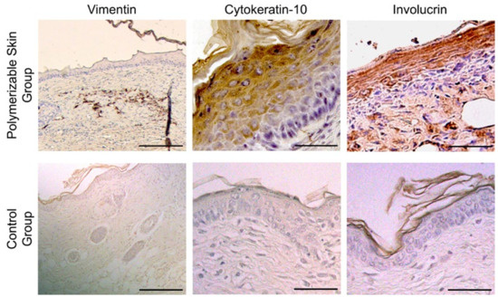 The samples from athymic mice’s grafted area (control and polymerizable skin groups) were fixed in 4% paraformaldehyde and embedded in paraffin. Deparaffinized tissue sections (5 µm) were rinsed with PBS solution twice for 10 min, incubated 5 min in 3% hydrogen peroxide (Sigma Aldrich) in absolute methanol (Sigma Aldrich) to inactive endogenous peroxidases, and permeabilized in a PBS solution containing 0.3% Triton X-100 for another 5 min. Following this, the samples were incubated for 48 h at 4 °C with primary antibodies anti-human involucrin (1:100, clone SY5, Sigma Aldrich), anti-human keratin 10 (1:100, clone LH2, Abcam) or anti-human vimentin (1:100, clone SP20, Abcam), containing 10% normal goat serum as a nonspecific reaction blocking agent. Next, samples were incubated with the peroxidase-conjugated secondary antibody (1:200) (Vector Laboratories, Burlingame, CA, USA) for 2 h. Subsequently, the samples were incubated with 0.03% H2O2 (Vector Laboratories), 0.1% 3,3′-diaminobenzidine (Vector Laboratories) in 0.1 M PBS pH 7.4 for 10–20 s or until a brown precipitate appeared. Finally, nuclei were counterstained with haematoxylin and tissue slides were dehydrated, cleared, and mounted. Photos were captured using the DM6000B bright-field microscope (Leica) fitted with a DFC310FX camera (Leica).
