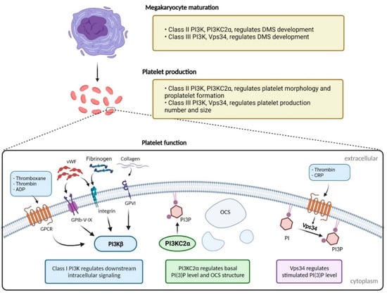 - Valet, C.; Severin, S.; Chicanne, G.; Laurent, P.A.; Gaits-Iacovoni, F.; Gratacap, M.-P.; Payrastre, B. The role of class I, II and III PI 3-kinases in platelet production and activation and their implication in thrombosis. Adv. Biol. Regul. 2016, 61, 33–41. [Google Scholar] [CrossRef]