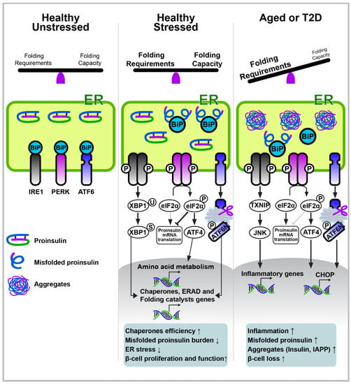 Insulin is initially translated as proinsulin, and its native structure is formed in the endoplasmic reticulum (ER). It is further processed in the secretory vesicles, where it eventually becomes bioactive insulin []. The ER is a membrane–bound organelle and is widely distributed throughout the cytoplasm of pancreatic β-cells. It is responsible for the folding and quality control of the secretory and transmembrane proteins that are transported to the appropriate locations after proper structure formation and modification occur. As insulin folding includes the formation of proper disulfide bonds crucial for insulin’s biological function and takes place mainly in the ER, maintaining proper ER proteostasis is critical. Indeed, numerous studies have suggested that ER dysfunction exacerbates both type 1 and type 2 diabetes [,,]. Moreover, ER dysfunction results in ER stress that accompanies other cellular stresses, such as oxidative stress, inflammation, and mitochondrial stress, all of which crucially affect β-cell dysfunction and the development of metabolic and aging-associated illnesses.