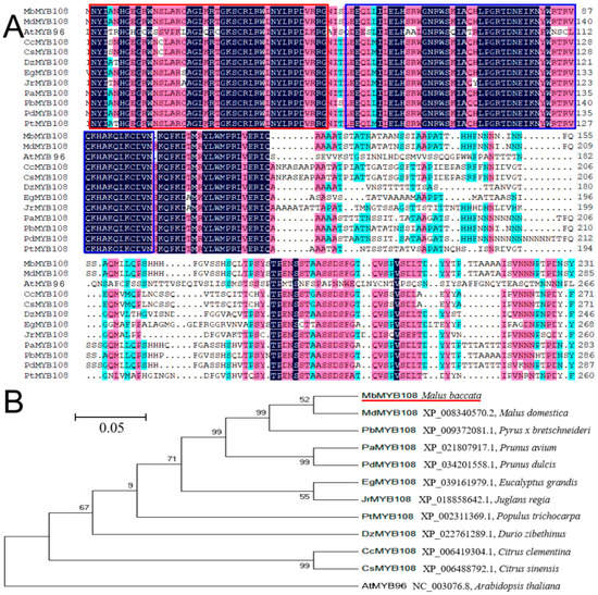 Comparison and phylogenetic relationship of MbMYB108 with other species of MYB transcription factor (TF) proteins. (A) Amino acid sequence alignment of MbMYB108 with other species of MYB TF proteins. Conserved domains are shown in red and blue boxes. (B) Phylogenetic tree analysis of MbMYB108 and other species of MYB TF proteins.