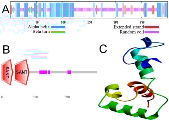 Structural prediction of MbMYB108 protein. Prediction of the secondary structure (A), domains (B), and tertiary structure (C).