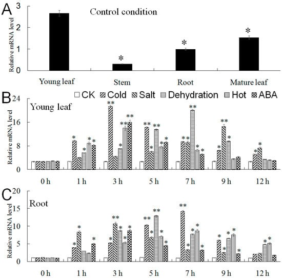 Time-course expression patterns of MbMYB108 in Malus baccata. (A) Expression patterns of MbMYB108 in young leaves (partly expanded), mature leaves (fully expanded), roots, and stems in normal condition (room temperature and normal watering). The expression level of young leaves was used as a control. Expression patterns of MbMYB108 in control condition (CK), low-temperature (4 °C), high-salt (200 mM NaCl), dehydration (20% PEG), high-temperature (38 °C), and ABA (50 μM) stress in young leaves (B) and roots (C) at the following time points: 0, 1, 3, 5, 7, 9, and 12 h. Data represent the mean of three replicates. Error bars represent standard deviation. Asterisks above error bars indicate significant differences between treatment and control (0 h) (* p ≤ 0.05, ** p ≤ 0.01).