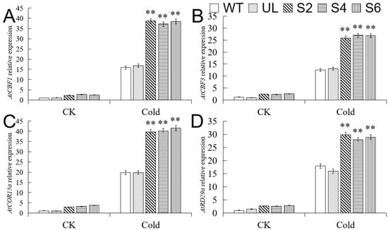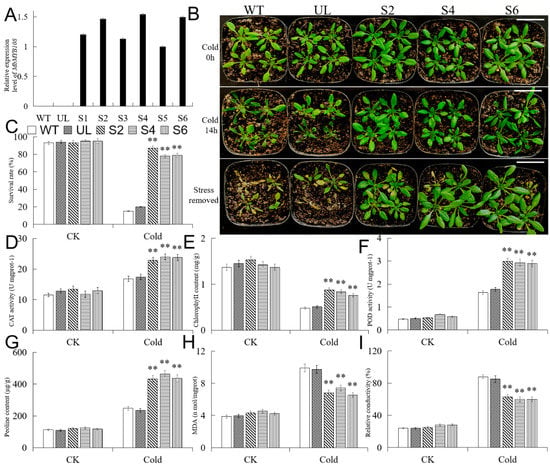 As shown in Figure 5B, no significant difference in appearance was found among all A. thaliana lines (WT, UL, S2, S4, and S6) under CK (Cold 0 h). However, after dealing with cold (−6 °C) stress for 14 h (Cold 14 h), the transgenic lines (S2, S4, S6) looked much healthier than WT and UL. Under CK, there were no significant difference in the survival rate among all A. thaliana lines (WT, UL, S2, S4, and S6). However, when subjected to cold stress, the survival rates of WT and UL A. thaliana were only 20.5% and 15.8%, while the average survival rate of transgenic (S2, S4, S6) lines reached 84.9%. The survival rates of transgenic (S2, S4, S6) lines were significantly higher than those of WT and UL lines under cold treatment (Figure 5C).