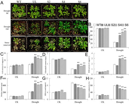 In order to understand the tolerance of different A. thaliana lines to drought stress, transgenic (S2, S4, S6), UL, and WT A. thaliana with the same growth vigor were not watered for 10 days, and then the phenotype of each line was observed. As shown in Figure 7A, the transgenic (S2, S4, S6), WT, and UL lines all grew well under CK (drought 0 days). However, when watering was stopped for 10 days (drought 10 days), the transgenic (S2, S4, S6) A. thaliana had a better appearance than WT and UL lines. Similarly, under CK, there were no significant differences in the survival rates of all A. thaliana lines (WT, UL, S2, S4, and S6). However, after 10 days of drought stress, the survival rates of WT and UL lines were only 26.8% and 25.5%, while the average survival rate of transgenic (S2, S4, S6) lines was 75.0%. The survival rates of the transgenic (S2, S4, S6) A. thaliana under drought stress were significantly higher than those of WT and UL lines (Figure 7B).