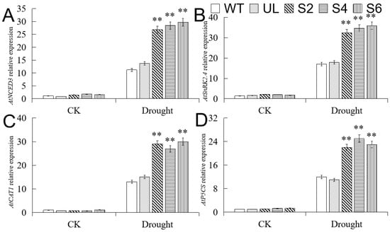 Relative expression levels of drought stress-related genes in WT, UL, and transgenic A. thaliana. Relative expression levels of AtNCED3 (A), AtSnRK2.4 (B), AtCAT1 (C), and AtP5CS (D). Data represent the mean of three replicates. Error bars represent standard deviation. Asterisks above error bars indicate significant difference compared to the WT line (** p ≤ 0.01).