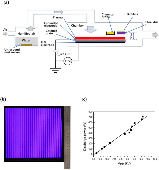 The steel discs with dry biofilms containing microbes, proteins, carbohydrates, DNA, and salt were placed into the discharge chamber with the inoculated side upwards (Figure 1a). The thickness of the biofilms on the steel discs varied from 0.05 μm to ~2.0 μm. The steel disc with the dry biofilm had its back to the surface DBD plasma to avoid UV irradiation. At the peak-to-peak voltage (VPP) of 8.25 kV, the humidified air DBD plasma was generated over the ceramic plate with a surface area of 155 mm × 155 mm (Figure 1b). The discharge power almost linearly increased from 25 W to 710 W when VPP increased from 5.7 kV to 9.2 kV (Figure 1c). In this study, the plasma inactivation of microbes in biofilms was performed at VPP = 8.25 kV, resulting in a discharge power of 460 W.