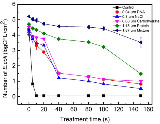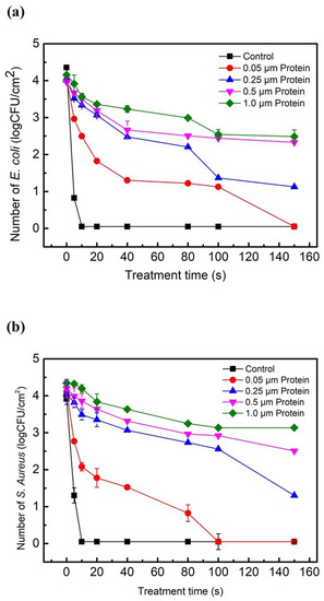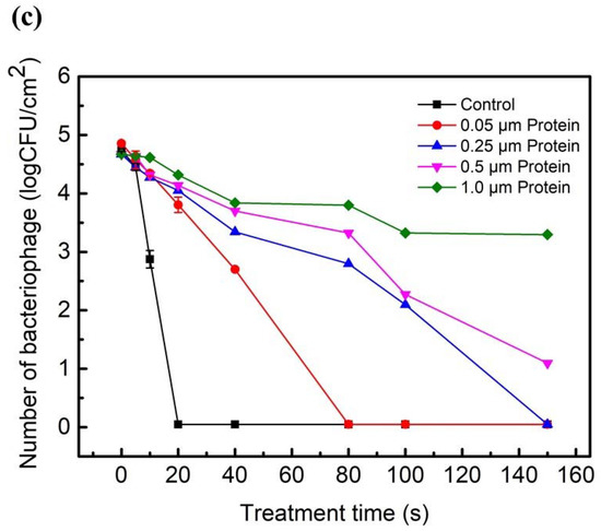 Figure 2 shows the number of surviving Escherichia coli (E. coli), Staphylococcus aureus (S. aureus), and bacteriophages in protein biofilms after exposure to plasma as a function of treatment time. The plasma treatment of 10 s resulted in the complete inactivation of E. coli not covered with biofilm. This confirms that humified air DBD plasmas are very effective in the inactivation of E. coli [1,3]. However, the inactivation efficiency of E. coli in protein biofilms was greatly reduced with an increasing thickness of the protein film (Figure 2a). After the plasma treatment of 20 s, the number of surviving E. coli in protein biofilms with a thickness of 0.05 μm, 0.25 μm, 0.5 μm, and 1.0 μm decreased by 2.2 Log, 1.0 Log, 0.8 Log, and 0.75 Log, respectively (Figure 2a). At a given thickness of protein biofilms, increasing the treatment time from 0 to 150 s led to a significant decrease in the number of surviving E. coli, indicating that the humified air DBD plasma was very effective in the inactivation of E. coli in protein biofilms.