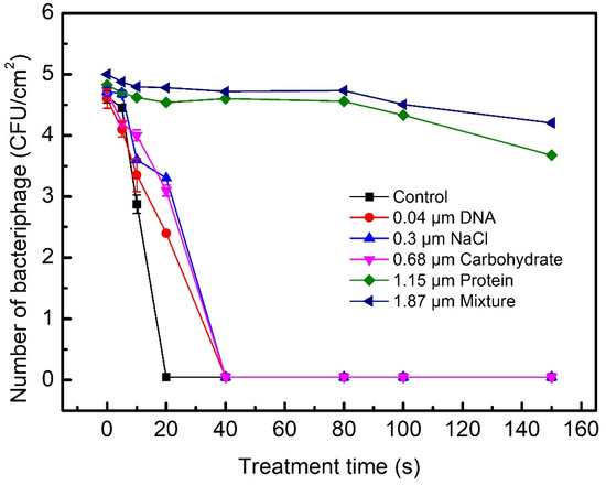 The effects of the main constituents of biofilms, such as proteins, carbohydrates, DNA, and salt on the plasma inactivation of E. coli and bacteriophages were compared, as shown in Figure 3 and Figure 4. The number of surviving E. coli in 0.04 μm DNA, 0.3 μm NaCl, and 0.68 μm carbohydrate decreases by ~3 Log within 40 s, and they showed similar tolerance to the plasma inactivation (Figure 3). Figure 4 shows that the plasma treatments for 40 s led to the complete inactivation of bacteriophage in 0.04 μm DNA, 0.3 μm NaCl, or 0.68 μm carbohydrate. Constituents of biofilms, such as DNA, NaCl, and carbohydrate are not highly resistant to the inactivation of E. coli and bacteriophages in biofilms. After the plasma treatment time of 40 s, the number of surviving E. coli and bacteriophages in the 1.15 μm protein biofilms decreased by 0.9 Log and 0.3 Log, respectively. The inactivation efficiency of E. coli and bacteriophages in the 1.15 μm protein biofilm slowly decreased when the treatment time increased from 5 s to 150 s. The 1.15 μm protein biofilm was highly resistant to the plasma inactivation of E. coli and bacteriophages compared to 0.04 μm DNA, 0.3 μm NaCl, and 0.68 μm carbohydrate. After plasma treatment for 40 s, the number of surviving E. coli and bacteriophages in the 1.87 μm mixed biofilms containing 2% DNA, 19% NaCl, 29% carbohydrates, and 50% proteins decreased by 0.7 Log and 0.3 Log, respectively, indicating that the high resistance to the plasma inactivation of E. coli and bacteriophages was mainly affected by the 50% proteins in the biofilms. Our measurements show that the inactivation efficiency of S. aureus as a function of time is consistent with that of E. coli and bacteriophages, which strongly depended on the thickness of the protein biofilms. However, it was not significantly affected by 0.04 μm DNA, 0.3 μm NaCl, or 0.68 μm carbohydrate.