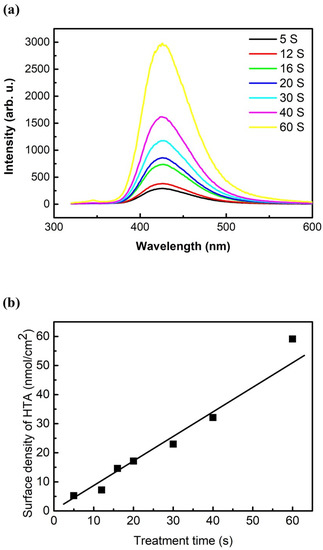 Three mL of terephthalic acid (TA) or 2,7-dichlorodihydrofluorescein diacetate (H2DCFDA) solutions as chemical probes was spread onto the petri dish to capture the RONS from the gas phase (Figure 1a). Both TA and H2DCFDA tended to react with RONS in solution, and their oxidation products can be identified by fluorescent measurements [14,15]. However, their molecular structures were completely different. A comparison between their oxidation pathways will be crucial for evaluating the chemical reactivity of RONS, such as ONOOH. Terephthalic acid (TA) can be oxidized into 2-hydroxyterephthalic acid (HTA) by RONS in aqueous solution, which emit light at λ = 425 nm (Figure 5a) [14]. The fluorescence intensity of HTA in the aqueous solution significantly increased with an increase in the plasma treatment time. The surface density of TA oxidized into HTA was calculated as a function of the treatment time (Figure 5b). When the treatment time varied from 5 s to 60 s, the surface density of HTA significantly increased, almost linearly, from 5.3 nM/cm2 to 59 nM/cm2, leading to the oxidation rate of 1.0 nM/cm2·s.