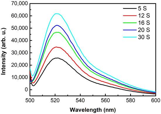 After the deacetylation of H2DCFDA in the NaOH solution, the non-fluorescent form (2,7-dichlorodihydrofluorescein, DCFH) can be oxidized into the highly fluorescent form 2,7-dichlorofluorescein (DCF) by the RONS from the gas phase [15]. The fluorescence spectra of DCF at 521 nm are shown in Figure 6. The fluorescence intensity of DCF in the aqueous solution significantly increased with an increase in the treatment time, confirming that DCFH was oxidized into DCF by the RONS from the gas phase.
