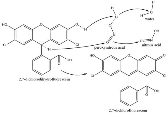 Pathways for the oxidation of 2,7-dichlorodihydrofluorescein (DCFH) by ONOOH. The homolysis of ONOOH into OH and NO2 radicals leads to the oxidation of DCFH into 2,7-dichlorofluorescein.