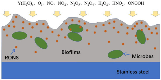 Mechanism for the inactivation of microbes in the biofilms by humidified air plasma. The humidified air plasma generates the long-lived RONS in the gas phase, such as Y(H2O)n, O3, NO, NO2, N2O5, N2O4, H2O2, and HNO2. These long-lived RONS diffuse into the biofilms and react with each other to generate very active species, such as OH and ONOOH, leading to the oxidation and inactivation of microbes in the biofilms.