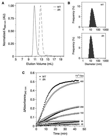 The SEC and DLS data (Figure 1A,B) of the DgrDps ∆N variant, lacking the initial 46 amino acid residues, are consistent with a protein of smaller dimensions, presenting a chromatographic peak at ~13 mL (equivalent to an apparent molecular mass of 160 kDa) and a Z-average value of 10.8 ± 0.7 nm, corresponding to a tailless Dps dodecamer, as expected.