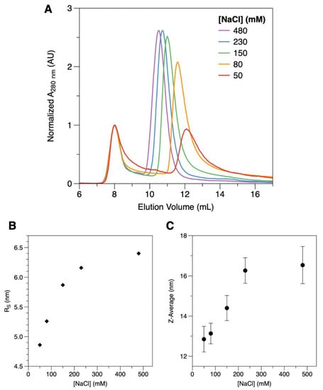 - La Verde, V.; Dominici, P.; Astegno, A. Determination of Hydrodynamic Radius of Proteins by Size Exclusion Chromatography. Bio-Protocol 2017, 7, 1–14. [Google Scholar] [CrossRef] [Green Version]