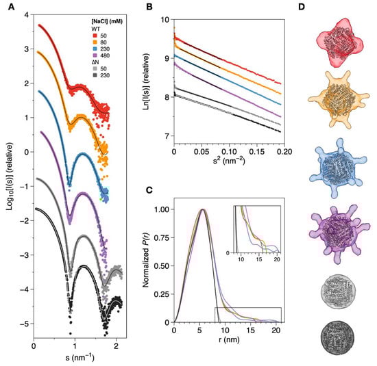 Overall, the scattering profiles of all the samples (Figure 4A) are similar and consistent with a particle shaped as a hollow sphere [], presenting a good signal-to-noise ratio, at least until s = 2 nm−1. The Kratky plots (Figure S1 of the Supplementary Materials) display consecutive bell-shaped Gaussian curves of decreasing intensity, consistent with properly folded and homogeneous globular proteins. A Guinier analysis of the scattering data (Figure 4B) shows good linearity for all the samples and a reasonably small deviation at low s2 values (below 0.01 nm−2) for all samples, suggesting low levels of aggregation or radiation damage. The Guinier plots were used to estimate the radius of gyration (Rg), which ranges from 4.38 nm to 4.67 nm for DgrDps WT as the ionic strength of the buffer increases. The Rg for the ∆N variant was calculated as 3.72 nm, regardless of the NaCl concentration (50 mM or 230 mM).
