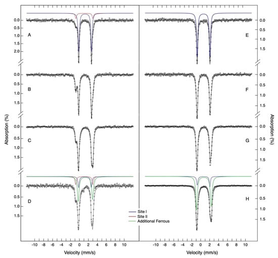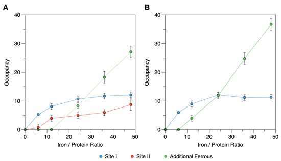 A similar analysis was carried out for the equivalent samples of the ∆N variant, in which case only two quadrupole doublets corresponding to site I and additional ferrous species were detected (Figure 5F–H). Noticeably, the site II subspectrum was absent for all the samples, while site I maximized at 11 Fe/protein (Figure 6B).