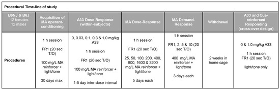 Summary of the procedural timeline for the MA study, which employed a within-subjects design to determine (1) sex and substrain differences in oral methamphetamine (MA) reinforcement and (2) the dose–response function for A33 effects upon oral MA reinforcement and the effect of 1.0 mg/kg A33 on cue-reinforced MA-seeking behavior.