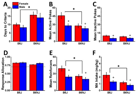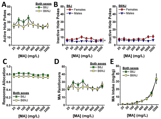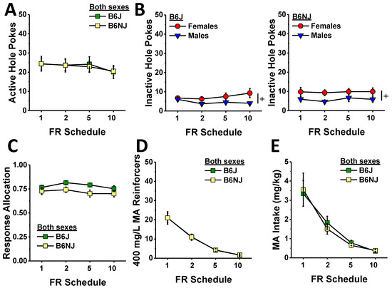 Summary of the substrain and sex differences in MA reinforcement during the dose–response phase of the study, highlighting the small or no group difference in the number of nose pokes into the active, MA-reinforced, hole (A) and the inactive, non-reinforced hole (B) in B6J (left) and B6NJ mice (right) as well as the response allocation (C), the number of reinforcers earned (D), and the MA intake (E) over a ~100-fold range in MA reinforcer concentrations. The data represent the mean ± SEM of 12 mice/sex/substrain. + represents a significant sex effect, p < 0.05.