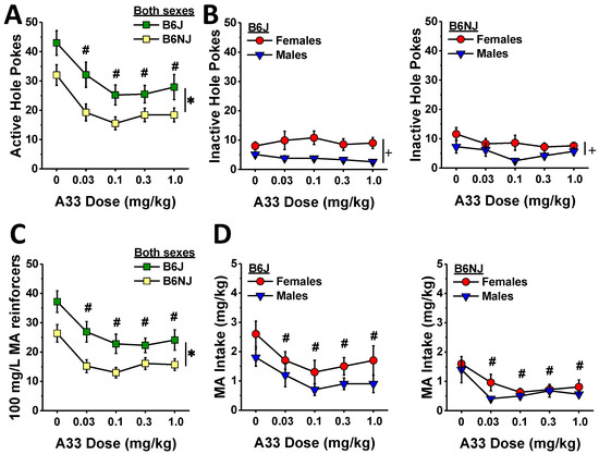 Summary of the effects of A33 pretreatment on established MA self-administration for a 100 mg/L MA reinforcer, highlighting the A33-induced reduction in the number of nose pokes in the active, MA-reinforced hole (A) but no A33 effect on nose poking in the inactive, non-reinforced hole (B) in B6J (left) and B6NJ mice (right). A33 also reduced the number of reinforcers earned, irrespective of sex (C) and lowered MA intake (D) in both B6J (left) and B6NJ (right) mice. The data represent the mean ± SEM of 12 mice/sex/substrain. * represents a main substrain effect; + represents a significant sex effect, p < 0.05; # p < 0.05 vs. 0 mg/kg A33 for both substrains/sexes.