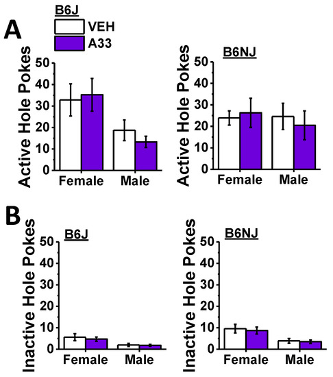 Despite the robust effect of A33 pretreatment on active hole responding (Figure 5A), none of the A33 doses altered inactive hole poking (Figure 5B) (A33 dose effect and interactions, all p’s > 0.20). Although an inspection of the data in Figure 5B suggested a more pronounced sex difference in inactive hole responding in B6J versus B6NJ mice, the interaction was not statistically significant (sex effect: F (1.41) = 18.60, p < 0.0001; substrain effect and interaction, p’s > 0.26).