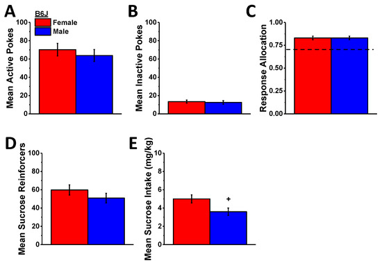 Comparison of oral 10% sucrose reinforcement between female and male B6J mice during the acquisition phase of this follow-up study, highlighting no sex differences in the mean number of nose pokes into the active, sucrose-reinforced hole (A) and the inactive, non-reinforced hole (B), the relative allocation of responding in the active vs. inactive hole (C), or the mean number of reinforcers earned (D). However, female B6J mice did consume more sucrose than males (E) over the last 3 days of sucrose self-administration training. The data represent the mean ± SEM of 11 mice/sex. + represents a significant sex effect, p < 0.05.