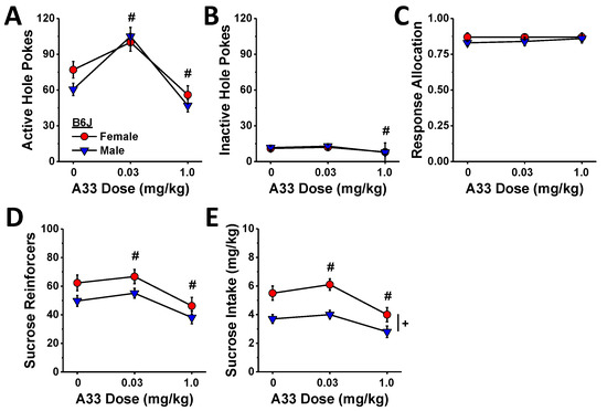 Summary of the effects of A33 pretreatment on established sucrose self-administration for a 10% sucrose reinforcer in B6J mice, highlighting a biphasic effect of A33 pretreatment on the number of nose pokes into the active, sucrose-reinforced hole (A), the number of reinforcers earned (D), and sucrose intake (E) by both female and male mice. Only the 1.0 mg/kg A33 dose reduced the number of nose pokes into the inactive, non-reinforced hole (B), and neither dose affected the allocation of responses across the two holes (C). The data represent the mean ± SEM of 11 mice/sex. + represents a significant sex effect, p < 0.05; # p < 0.05 vs. 0 mg/kg A33 for both sexes.