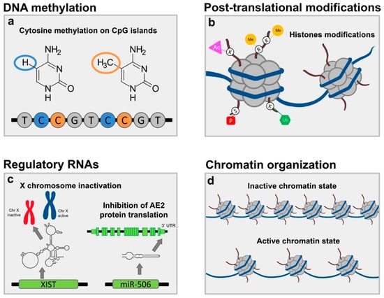 Epigenetics includes all modification of DNA or related factors that do not involve the DNA sequence and can be inherited []. Cellular heterogeneity and identity is controlled by epigenetic information since the genomic sequence is identical in all cells of the body [,]. There are three different types of epigenetic information: DNA methylation, post-translation changes of histones (e.g., acetylation, methylation, ubiquitylation, as well as histone variants), and non-coding RNAs (including microRNAs, miRNAs, and long non-coding RNAs, lncRNAs). The fourth pillar of epigenetics is chromatin organization (e.g., DNA accessibility and domain organization), yet in PBC, this topic has been barely explored; therefore, this review will focus only on the three other pillars.