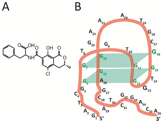 The chosen object, aptamer 1.12.2, is a 36-nucleotide single-stranded DNA [16] capable of binding a low-molecular-weight toxicant, ochratoxin A (OTA) (see Figure 1B), a widespread contaminant of many agricultural plants that is characterized by its complex toxic effects on humans and animals [17]. For this aptamer, there are no direct data on the spatial structure, with only general principles of its structural organization being available [15,17,18,19,20]. The aptamer 1.12.2 is composed of an antiparallel G-quadruplex, a 5’-, and a 3’-tail. Fadock et al. suggested the structural organization of the aptamer [18] depicted in Figure 1B.