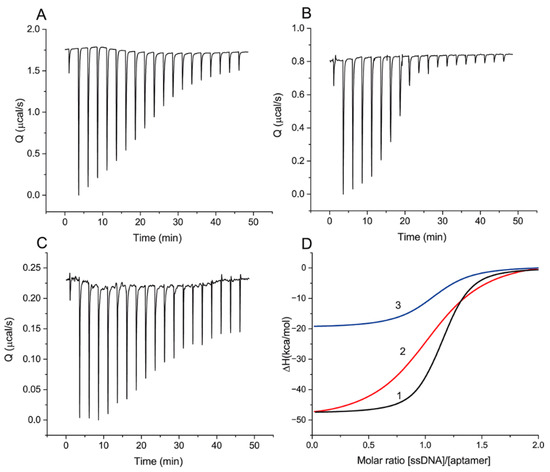 ITC measurements for sequential additions of ssDNA to aptamer: (A)—300 µM of ssDNA {1–8} to 25 µM of aptamer, (B)—100 µM of ssDNA {28–36} to 8 µM of aptamer, (C)—60 µM of OTA to 5 µM of aptamer. (D) The integrated heat plots for ssDNAs {1–8} (1) and {28–36} (2) and for OTA (3).