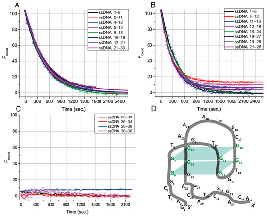 - ssDNAs {21–28} and {21–30} have 4 and 6 bases overlapping with the 3′-tail, respectively, and 4 bases overlapping the quadruplex, including the 23th and 24th guanines participating in the guanine tetrads’ formation.