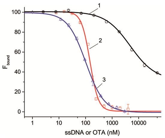 The dependences of the percentage of bound OTA-Flu on the concentration of ssDNA or OTA, (1)—{30–36}, (2)—{5–13}, and (3)—OTA. n = 3.
