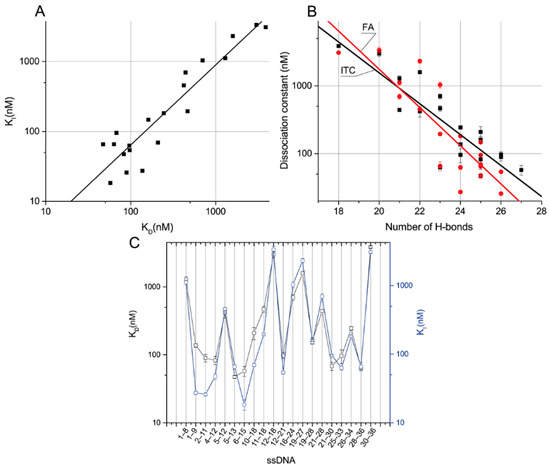 Linear approximation of the dependences of these constants on the number of H-bonds in semi-logarithmic coordinates gives the following equations—H-bonds =7.7 − 0.228 × KD, with adjusted R2 = 0.75, and H-bonds = 8.9 − 0.28 × KI, with adjusted R2 = 0.76, respectively (Figure 5B). Thus, both dissociation constants tend to increase as the number of H-bonds increases. The correlation is not absolute and this fact can be explained by the nearest-neighbor effect [27], which consists of the influence of neighboring nucleotides on the formation of nucleotide pairs in DNA duplexes. It was noted in [28] that this effect is especially pronounced for sequences with a length of fewer than 12 nucleotides. Of all the characterized ssDNAs, the maximum degree of difference in KD and KI was observed for ssDNAs {28–26} and {16–24} with 23 H-bonds each, amounting to 11 and 16 times, respectively. The following data demonstrate a comparison of the aptamer–ssDNA dissociation constants with the aptamer–OTA one.