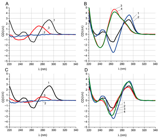 (A) CD spectra of aptamer (1), ochratoxin A (2), and ssDNA {6–15} (3). (B) CD spectra of the aptamer (1), the aptamer–OTA complex (2), the aptamer–ssDNA complex {6–15} (3), and the aptamer–OTA complex after the addition of ssDNA {6–15} (4). (C) CD spectra of aptamer (1), ochratoxin A (2), and ssDNA {28–36} (3). (D) CD spectra of aptamer (1), aptamer–OTA (2), aptamer–ssDNA {28–36} (3) and aptamer–ssDNA {28–36} after the addition of OTA (4). The reagent concentrations are 1 μM for all spectra.