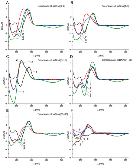 Figure 7A,B, indicate the unfolding of the G-quadruplex caused by ssDNAs {1–8} and {1–9} and the formation of dsDNA. For both ssDNAs in the presence of 1 μM of OTA, the spectrum (3) shows the shift in the positive extrema from 275 to 285 nm, i.e., to the initial location of the extremum for the G-quadruplex (Figure 7A,B). The shift is more pronounced in the case of ssDNA {1–8}. Note that three extrema in the range 230–260 nm are typical of the CD of an antiparallel quadruplex (Figure 7A). The addition of the excess (10 μM) of OTA (see spectra 4 in Figure 7) leads to the further transition of the aptamer–ssDNA spectra into the spectra similar to the antiparallel G-quadruplex (Figure 7A,B). That gives us evidence that the aptamer preserves OTA-binding activity in complexes with ssDNAs {1–8} and {1–9}. The transition from the aptamer–ssDNA complex to the aptamer–OTA complex is accompanied by the restoration of the initial quadruplex structure. Interestingly, in the case of an aptamer complex with ssDNA {6–15}, no changes occurred, not only in the case of the equimolar OTA:aptamer ratio but also for a 10-fold excess of OTA (see Figure 7C). The complexes of aptamer with ssDNAs {21–28} and {21–30} in the presence and absence of OTA behaved similarly as the complexes with ssDNAs {1–8} and {1–9} (Figure 7D,E). The CD spectral extrema of all complexes are presented in Table S5.