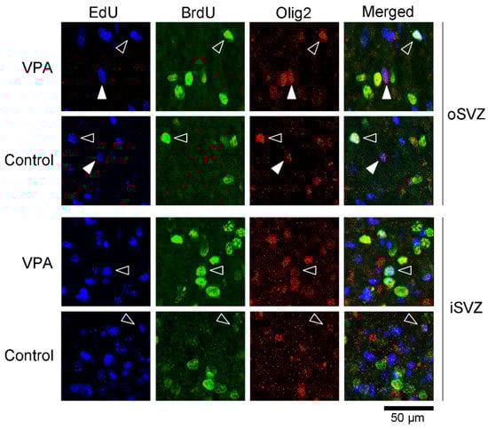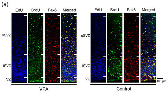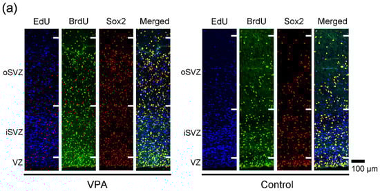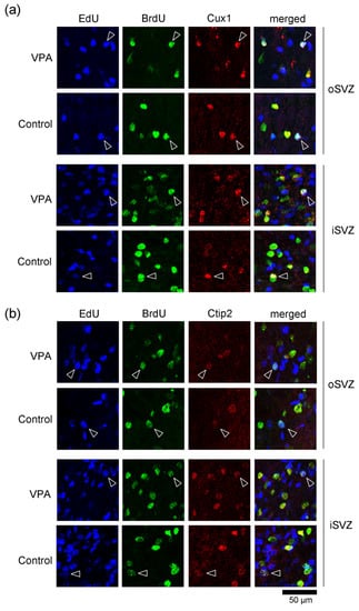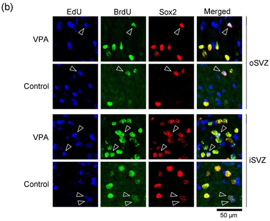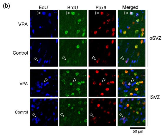 EdU-labeled cells, which proliferated 24 h before the first VPA injection (at postnatal day (PD) 5), were distributed abundantly in the iSVZ and diffusely in the oSVZ on PD 7 (Figure 1a). Although a great majority of these cells were single-labeled with EdU, some were also labeled with BrdU, indicating that these cells experienced a second round of cell division 48 h after EdU injection in both VPA-exposed and control groups (Figure 1). In contrast, BrdU single-labeled cells were distributed diffusely in the iSVZ through the oSVZ (Figure 1a). BrdU labeling was observed in proliferating cells immediately following the second VPA injection in the VPA-exposed group. Positivity of immunostaining for various markers was examined in EdU single-, BrdU single-, and EdU/BrdU double-labeled cells. Some of these cells were immunopositive for Sox2 (a marker for neuronal stem cells [,,]) (Figure 1); Pax6 (a stable marker for bRG across mammals [,,]) (Figure 2); Olig2 (expressed in progenitors with glial progeny [,]) (Figure 3); Cux1 (a marker for postmitotic upper cortical layer neurons []) (Figure 4a); and Ctip2 (a marker for postmitotic upper cortical layer neurons []) (Figure 4b).
