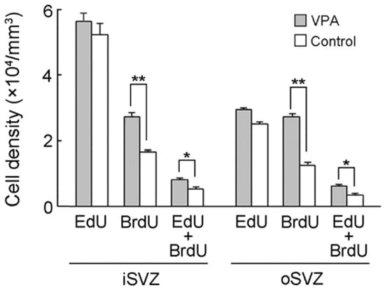 VPA mediates neurogenesis by regulating the proliferation, maintenance, and differentiation of neuronal stem/progenitor cells, although the effects of VPA vary depending on the exposure time points and neuronal stem/progenitor cell types. For example, VPA mediates the upregulation of Wnt/β-catenin pathways [] and the proliferation of dentate gyrus (DG) progenitors in the developing hippocampus [,], and promotes the adult neurogenesis of DG progenitors by inhibiting HDAC activity []. In contrast, VPA alters the cell-cycle exit of subventricular zone (SVZ) progenitors via the inhibition of HDAC activity during the early stage of cortical neurogenesis in mice []. In our recent study, VPA exposure during the late stage of cortical neurogenesis increased the density of cortical neurons derived from basal radial glia (bRG) in ferrets []. The bRG, also called the outer RG or transient RG, are self-renewable neuronal stem cells that appear transiently in the inner and outer subventricular zones (iSVZ and oSVZ) during cortical neurogenesis in humans [,] and other mammalian species [,,,], including ferrets []. They are distinct from intermediate progenitor cells which are classically known cortical progenitors [,]. Likewise, bRG emerges in the developing cortex of mice, but is less abundant than in primates and carnivores [,]. Therefore, ferrets are more suitable than rodents for investigating the effect of VPA with bRG as a target. Therefore, this study aimed to determine the intermediate influence of VPA exposure on the proliferation, maintenance, and/or differentiation of bRG in the developing cerebral cortex, which may be involved in gyrification anomalies previously reported in ferrets []. Two thymidine analogues, 5-ethynyl-2′-deoxyuridine (EdU) and 5-bromo-2′-deoxyuridine (BrdU), were administered within a 48 h interval to label proliferating cells before and after VPA exposure. This administration schedule can also label self-renewing bRG in ferrets [].